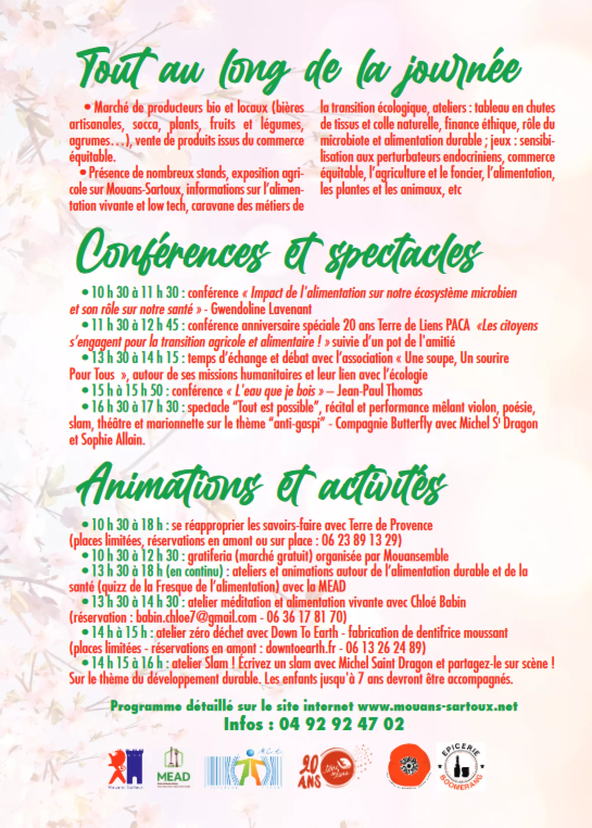 Co-organisé par la Maison d’Education à l’Alimentation Durable (MEAD) de la Ville de Mouans-Sartoux, la Maison du Commerce Equitable (MCE), l’Epicerie Boomerang et Nous voulons des coquelicots – Mouans-Sartoux.