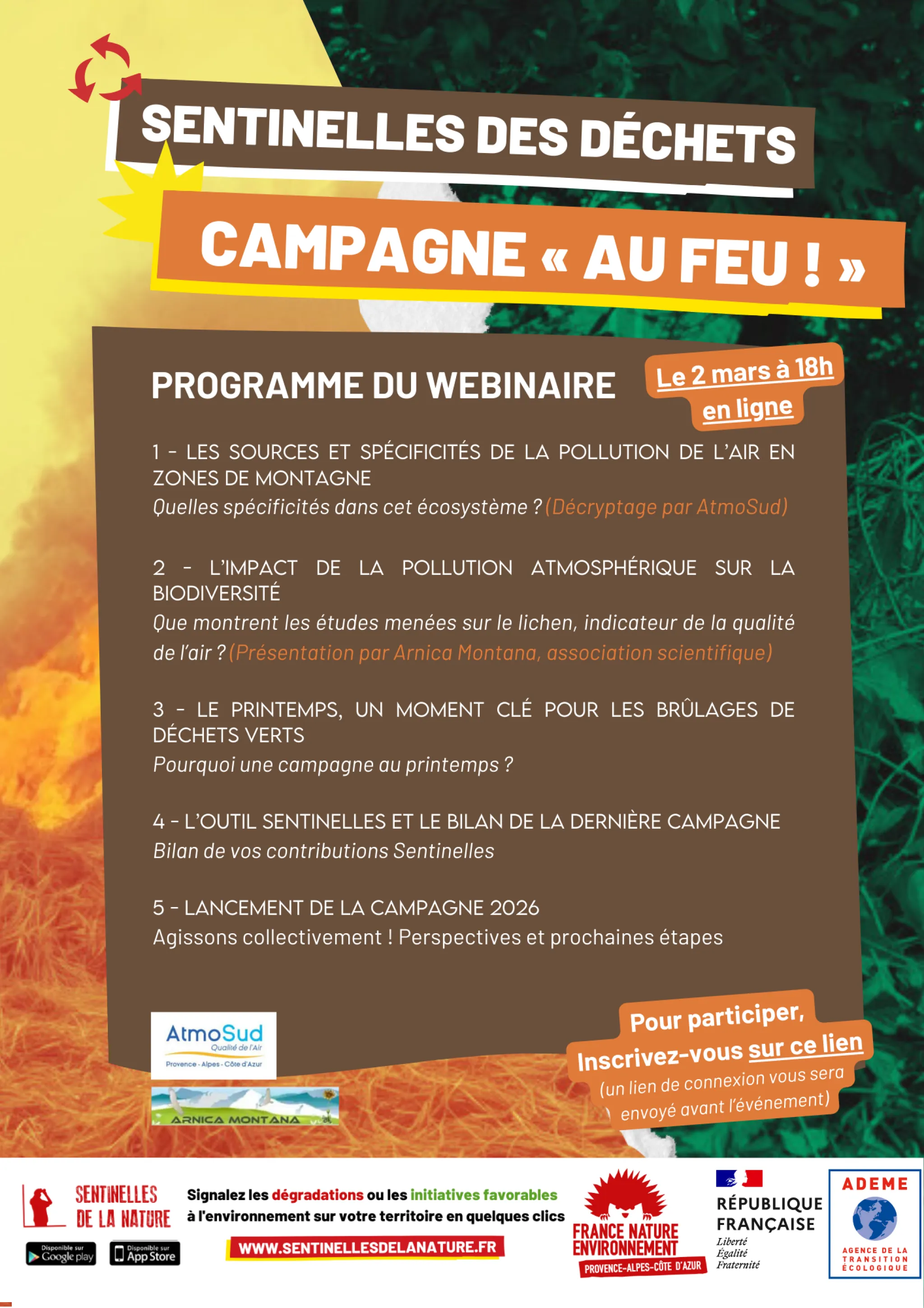 Nous vous invitons à notre webinaire de lancement le lundi 2 mars 2026 à 18h, en présence d’AtmoSud et Arnica Montana ! Pour cette campagne, nous aborderons l’impact des brûlages en montagne, un milieu spécifique loin d’être exempté des pollutions.