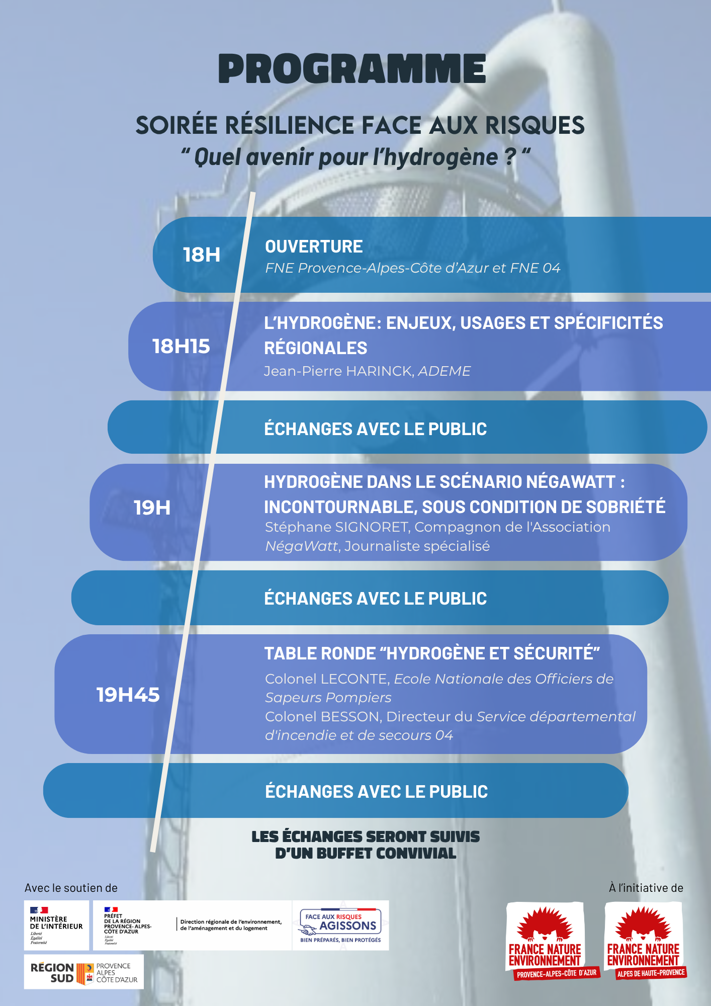 Dans le cadre de la journée nationale de la résilience face aux risques industriels et naturels, FNE Provence-Alpes-Côte d’Azur et FNE Alpes-de-Haute-Provence vous invitent à une soirée résilience face aux risques consacrée à l’hydrogène. Les problématiques de stockage et de transport seront au centre de la conversation, avec des interventions d’expert·es institutionnel·les, associatif·ves et de la sécurité pour nourrir le débat.