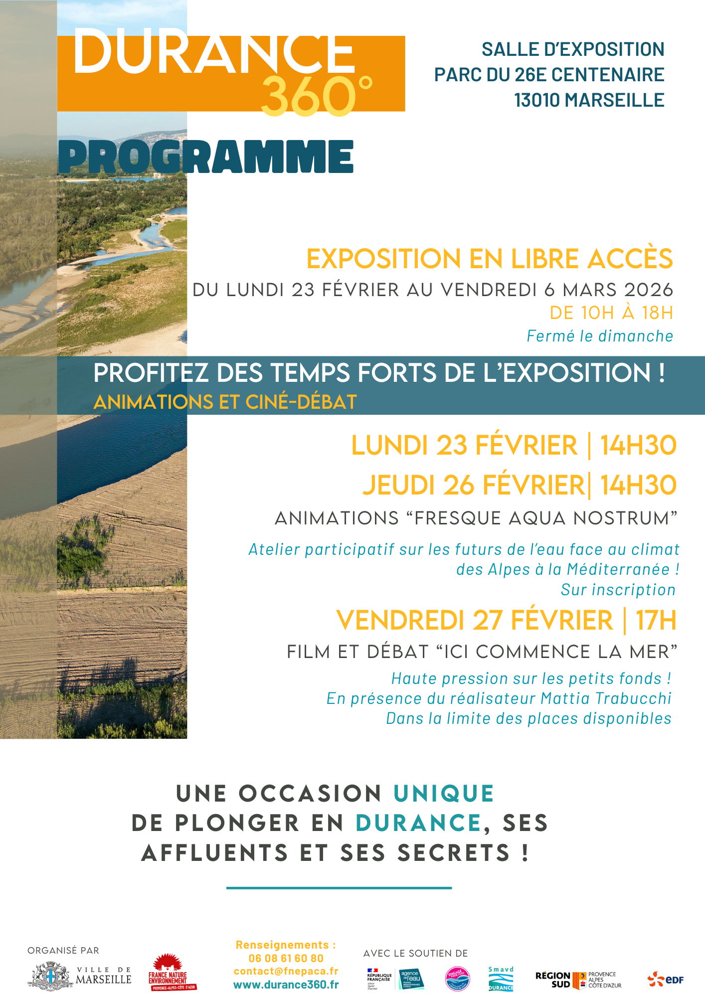 Du lundi 23 février au vendredi 6 mars 2026, venez vous immerger dans les rivières du bassin de la Durance dans la salle des expositions du Parc du 26e centenaire. Cet outil pédagogique raconte le cycle de l’eau avec l’histoire de la Durance, les interactions fortes entre l’humain et ce milieu spécifique, ainsi que leur évolution au fil du temps.