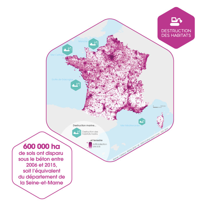 En France, la principale cause de perte, fragmentation et dysfonctionnement des habitats naturels est liée aux changements d’occupation des sols, du fait de l’augmentation de l’urbanisation et des cultures agricoles et sylvicoles intensives. (Nature France)