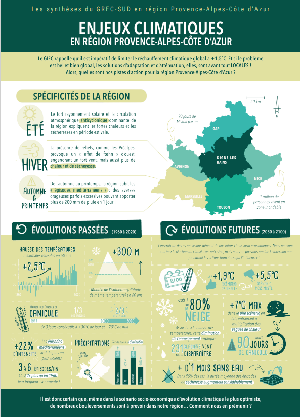 La température la moyenne régionale devrait augmenter de +1,6 à +2,2 °C d’ici 2050 selon les projections du GIEC. En même temps, la fréquence ainsi que l’intensité des journées chaudes et vagues de chaleur s’intensifient alors que les journées froides et jours de gel régressent, en particulier en moyenne montagne : le nombre annuel de jours de gel à Embrun (une centaine) devrait être divisé par deux d’ici la fin du siècle, d’après le GREC Sud) pourtant ce froid est nécessaire pour de nombreuses espèces animales mais aussi végétales adaptées à ces milieux et ces contraintes. Enfin, le dérèglement climatique en région PACA a également pour conséquence la hausse d’évènements extrêmes telles que les tempêtes ou les sécheresses qui ont des effets néfastes sur les habitats, les espèces, et la société humaines. A noter que l’artificialisation des sols potentialise les dégâts par exemple des inondations (puisque le sol ne peut absorber l’excédant d’eau).